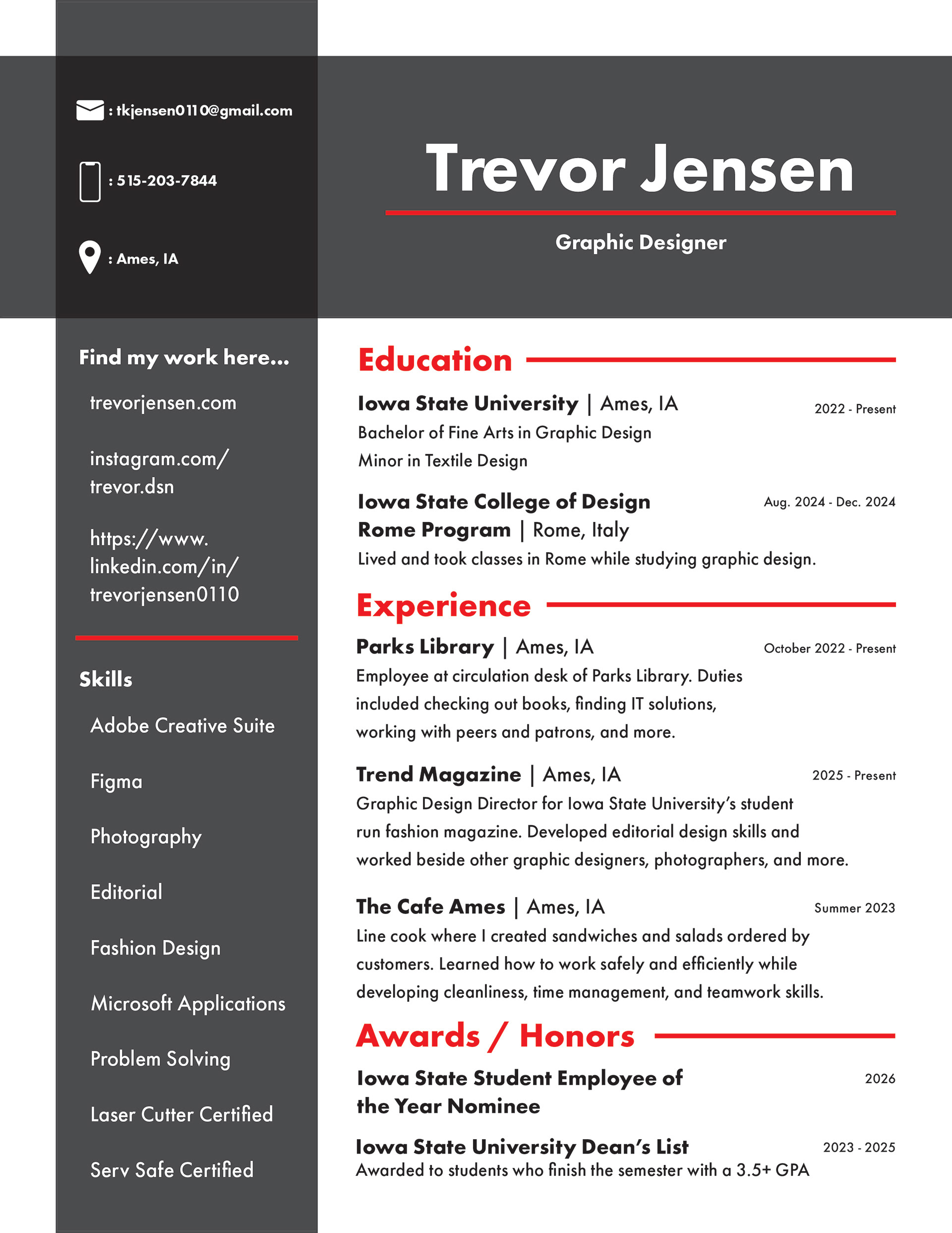 Hello! Thank you for visiting my portfolio. My name is Trevor Jensen, and I am pursuing a B.F.A. at Iowa State University in Graphic Design with a minor in Textile Design. I was born and raised in Ames, Iowa, where I still live today. I am eager to keep growing as a creative and a designer, and will update this site as I do so. Thanks!